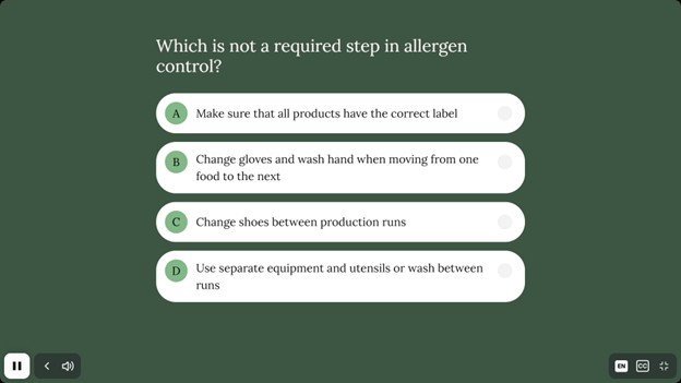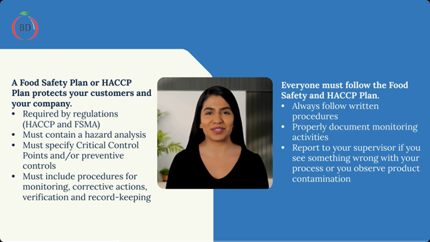 The content of the courses was developed using several teaching theories when identifying instructional approach. The goal is to motivate employees and measurably increase their knowledge in areas pertaining to food safety, such as FSMA and HACCP overview, Food Defense, Allergen Management, GMPs, GFSI and Workplace Safety. Each training course lasts approximately 10 minutes and has a built-in verification quiz. Content of training modules is in compliance with requirements for employee food safety / food hygiene training as outlined in Preventive Controls for Human Food regulation, HACCP regulation and Global Food Safety Initiative (GFSI) requirements. Workplace Safety Training relates to OSHA requirements for ensuring safety of your employees. TRAINING IS AVAILABLE IN ANY LANGUAGE OF YOUR CHOICE!